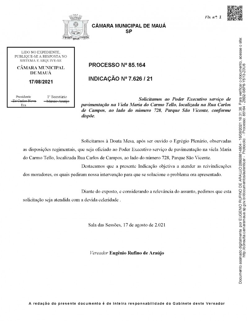 Através da indicação número 7.626/2021, o vereador Eugênio Rufino, do PSDB, está solicitando ao executivo municipal o serviço de pavimentação da viela Maria do Carmo Tello, localizada na Rua Carlos de Campos, altura do número 728, no Parque São Vicente. Na justificativa da indicação, já protocolada na Câmara de Vereadores de Mauá, o parlamentar destaca que o pedido atende a solicitação de moradores e comerciantes daquela região.