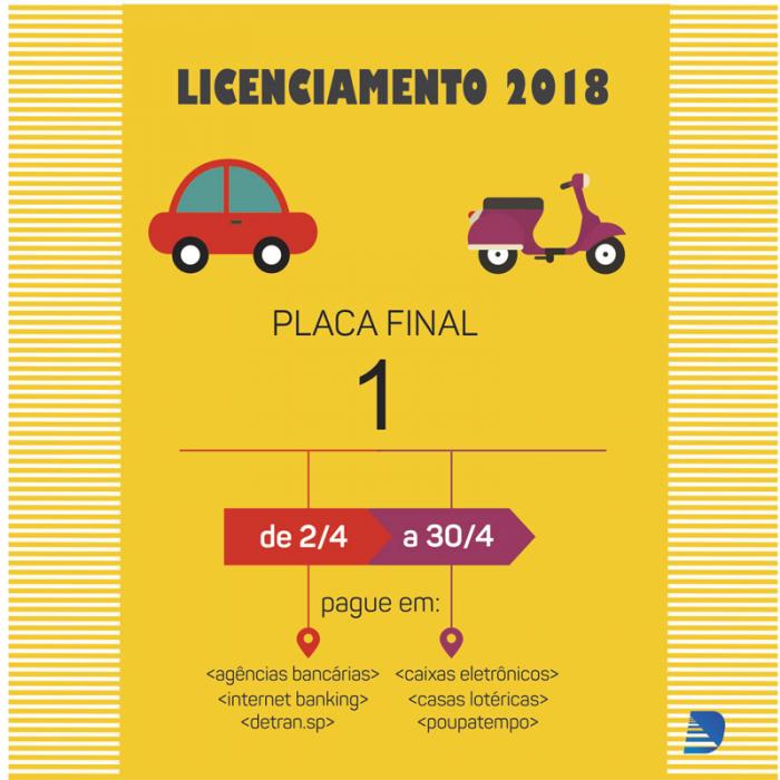 Proprietários de veículos com placa terminada em 1 têm até o dia 30 de abril, próxima segunda-feira, para fazer o licenciamento do exercício 2018. Caso contrário, não pode rodar a partir desta data até regularizar a documentação.