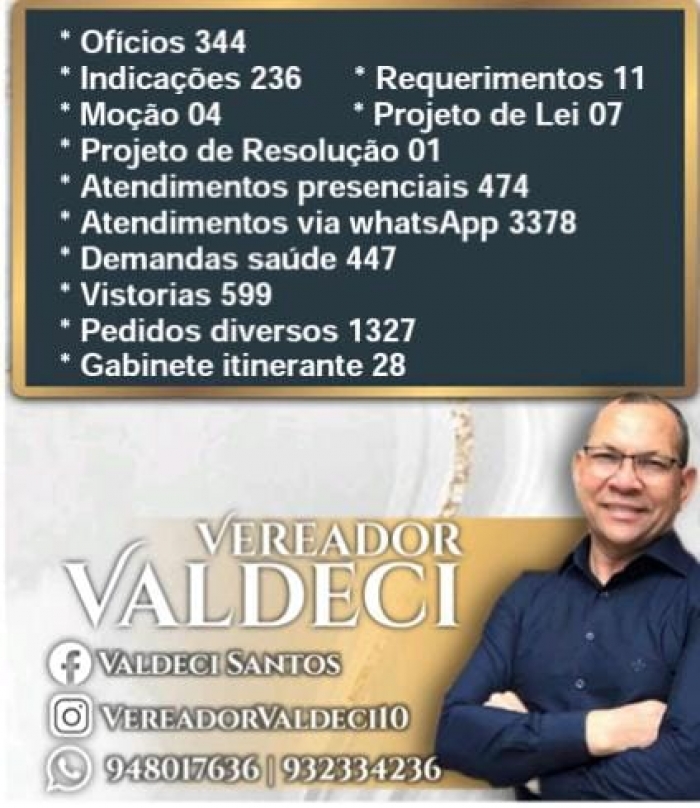 “Nosso primeiro semestre de 2022 foi de muito trabalho. O melhor desse semestre foi o retorno da presença dos munícipes na Câmara, sessões e principalmente nos gabinetes, nada melhor do que o olho no olho. Sentar com cada munícipe, ouvir suas demandas, suas histórias e sempre que possível poder ajudar, é muito gratificante. Nesse primeiro semestre intensificamos as visitas, vistorias e, consequentemente, os encaminhamentos e cobranças. Infelizmente não podemos resolver tudo, mas não medimos esforços para ajudar, o que depender desse vereador e estiver ao nosso alcance faremos. Meu gabinete está de portas abertas para atender nossos munícipes, venha nos fazer uma visita, tomar um café, traga suas demandas, críticas e sugestões de segunda a sexta, das 8h00 às 17h00”, completou o vereador Pastor Valdeci.