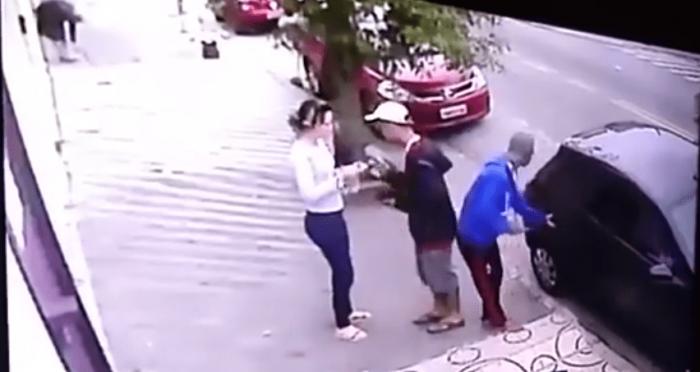 Após a primeira abordagem, outro sujeito chega e toma os pertences que estavam na mão desta mãe e entram todos no carro. O grupo ainda demora a sair, enquanto a mulher pega a sua filha e sai andando para o lado contrário. Os meliantes levam o veículo.